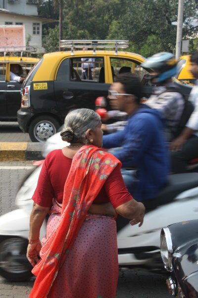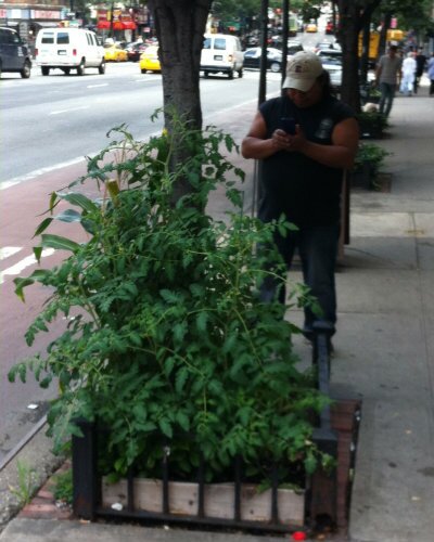 Photo 1: Corn, tomatoes and peppers in a street tree pit "micro-garden" in East Midtown, New York City. Photo 2: A woman walking in a street in Mumbai. It may not be walkable, but she is walking in it. Both photos by David Maddox.
