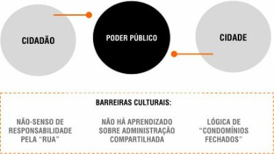- Não há aprendizado sobre administração compartilhada: o brasileiro não aprende a administrar de forma compartilhada as questões do lar, da escola e dos espaços públicos. Desta forma, não sente responsabilidade pelas decisões tomadas nessas esferas ao longo da sua vida, o que dificulta uma formação participativa e coletiva na construção da cidade.