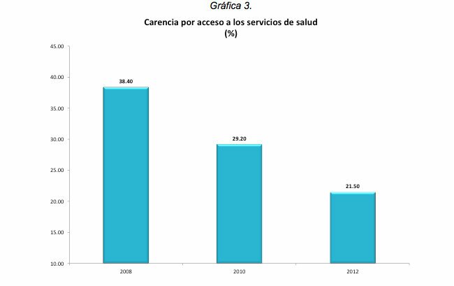 En lo que respecta a la salud, señala que en el 2012, el 21.5% de la población tenía carencia en el acceso a los servicios de salud, poco más de 25 millones de personas: