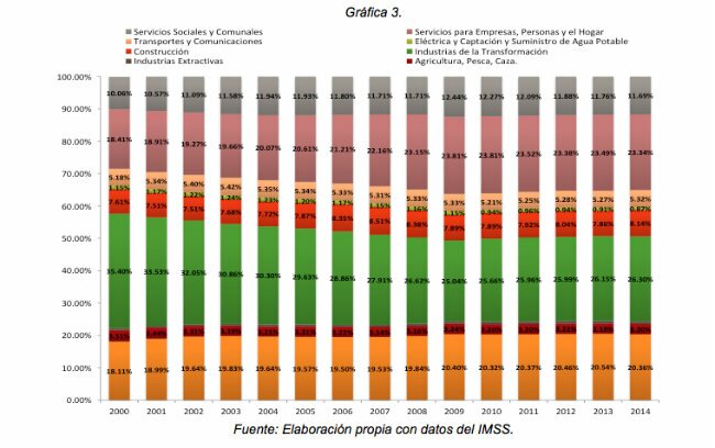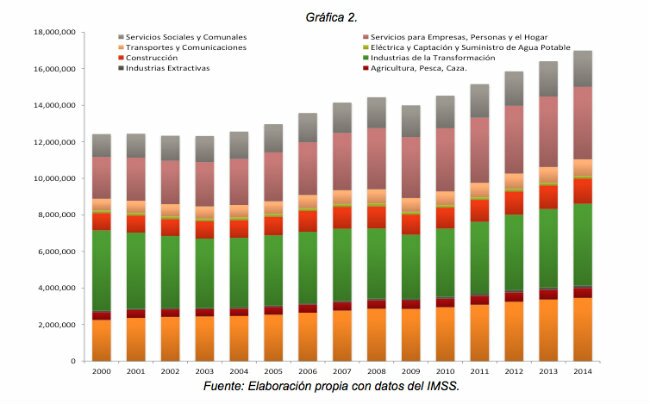 Tal como se puede observar, el número de asegurados ha presentado los últimos 15 años una tasa de crecimiento media anual (TCMA) de 2.26%, dato similar al crecimiento económico durante dicho período, pasando de 12.42 millones en el año 2000 a 16.99 millones para el año 2014.