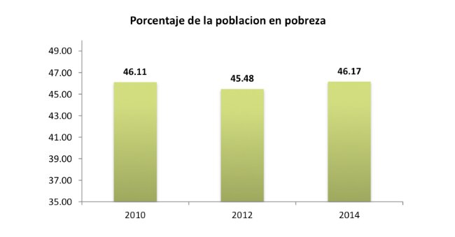 De la gráfica anterior, se desprende que visto el problema en términos absolutos, en 2010 el país presentaba 52.8 millones de pobres; en 2012, 53.3 millones y finalmente, en 2014 hay 55.3 millones.