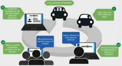 Aventones es una plataforma en línea que promueve y facilita la cultura de compartir autos y taxis dentro de comunidades de confianza como lo son las empresas, las instancias de gobierno y las universidades. Es un sistema en donde personas que pertenecen a una misma institución se organizan y se comunican entre sí para encontrar rutas, horarios, y espacios vacíos de manera segura; de esta manera, aprovechando mejor los recursos.