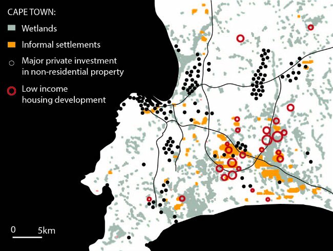 In South Africa and the global South, therefore, the 'green' model should not uncritically reference global Sustainable Development trends only, but should also appropriately address their own unsustainable trends. For example, most informal settlements in South Africa are on flood-prone land, experience extreme weather and fires from dense and sub-standard dwellings (figure 2), are susceptible to disease, and also generate pollution by wastewater and burning of fossil fuels. In such contexts, environmental integrity becomes almost inseparable from social ethics, and sustainability becomes almost impossible without transformation. If left unchecked, 'green' may well turn into a new kind of hegemony, justifying further investment in the wealthiest areas at the expense of the poorest (figure 3).