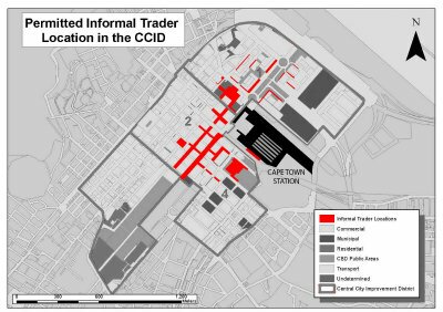 But these openings had other consequences. As South African cities became open to all, central business districts (CBDs) fell victim to urban decay as those who feared the process of integration left these areas. Today these CBDs have embarked on various urban regeneration models centered in the neo-liberal school of thought, to attract formal business back. In Cape Town CBD this has left informal traders in a strange reality: although accommodated and relatively affluent in the country's most attractive and tourist-friendly CBD, their numbers and permitted places of trade are highly restricted: of the major metros, Cape Town CBD contains the fewest number of traders but the lengthiest street trading by-laws (fig. 1).