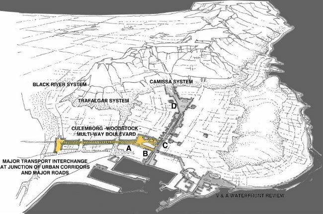 If a new policy direction is to be taken seriously, the City then could revisit Louw and Dewar's intelligent — though apparently abandoned — decade-old proposal which recommended terminating the rail system outside the CBD and building a major new interchange there. This interchange would be linked back into the CBD with a "magnificent" linear public space with an inner city public transportation system, "creating maximum opportunities for small businesses, which are vital to the future of the city" (fig. 4).