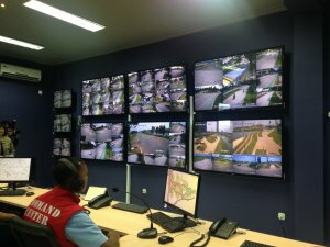 The tour included a visit to the command center, where at least three people monitor 80 CCTVs 24 hours a day. While crime rates are very low, the center works to anticipate traffic conditions, respond to traffic accidents, and to any calls from the community's numerous emergency call boxes.