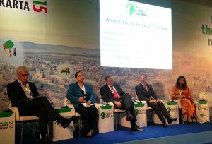 Nick Clark, Environmental Editor at Al Jazeera English started this discussion by asking each panelist to describe some of the main urban water challenges in each of their local contexts. Carla May Berina-Kim, the Executive Director of the Manila Water Foundation, explained that in Manila, illegal water connections lead to quality issues, and that while water coverage is fairly good, only a third of the city has coverage when it comes to sewage. Lack of sewage infrastructure — the result of poor urban planning — is a main cause. Koen Broersma, a Consultant of Urban Water Management at Royal HaskoningDHV described the situation here in Jakarta: water supply is lacking, causing residents to use wells and pumps, which then causes subsidence (land sinking) and flooding. Untreated wastewater flooding to the sea is another major concern. Roch Cheroux, the CEO South East Asia at Suez Environnement explained that in Australia, the driest continent, lack of water is a challenge, as is affordability — utilities are not run efficiently, so costs are high. Also, Australia’s water infrastructure is old, and renewing it would be costly. Finally, Aziza Chaouni, Founding Principal at Aziza Chaouni Projects, indicated that in Morocco, too, lack of water is an issue — especially since agriculture, a major source of income for Moroccans, requires heavy water use. Read more.
