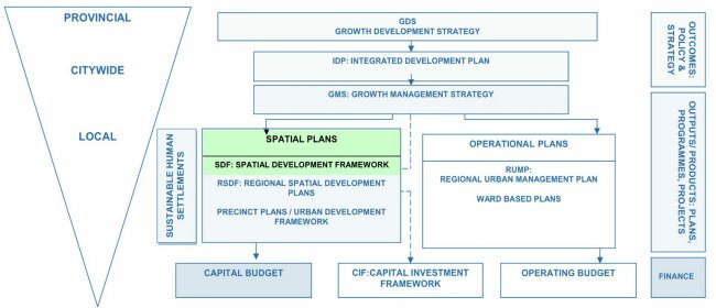 The SDF is part of a broader planning process, and sits within a broader suite or package of plans influenced by, and taking direction from, the Integrated Development Plan of the city (fig. 3). It thus has primary legislative function. At another level, the SDF provides the overriding long term spatial vision for the City, exploring appropriate spatial development challenges and scenarios for a "Future City". The dynamics of the city are constantly changing (or rather our understanding of these dynamics is maturing), and a spatial plan that may have been 'appropriate' a decade ago may now have become an obstacle to sustainable urban growth.