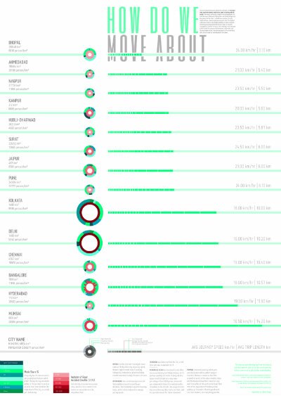 In an effort to unearth stories from urban India's commuting habits, EMBARQ India and Urban Mobility India launched the Data Visualization Challenge. The contest asked urban planners, designers, data scientists, and civil society to help better visualize how people move about in Indian cities. Thirty entries came in from all over the country and focused on a wide variety of issues, including how women get around in Delhi, dominant transport modes in multiple cities, and real sources of air quality issues across urban India. Five winners were selected based on relevance to the theme, data analysis, aesthetic appeal, and tools used.